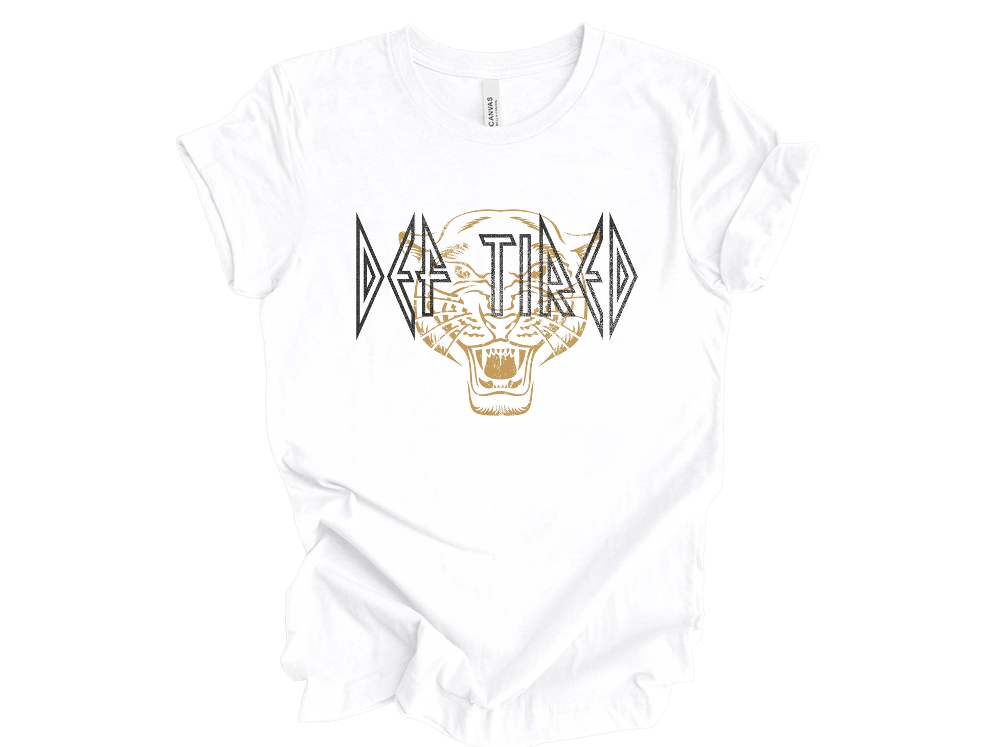 The Vibe: A bold, rock-inspired "DEF TIRED" headline across a fierce, golden-tan tiger graphic for a vintage, edgy look.