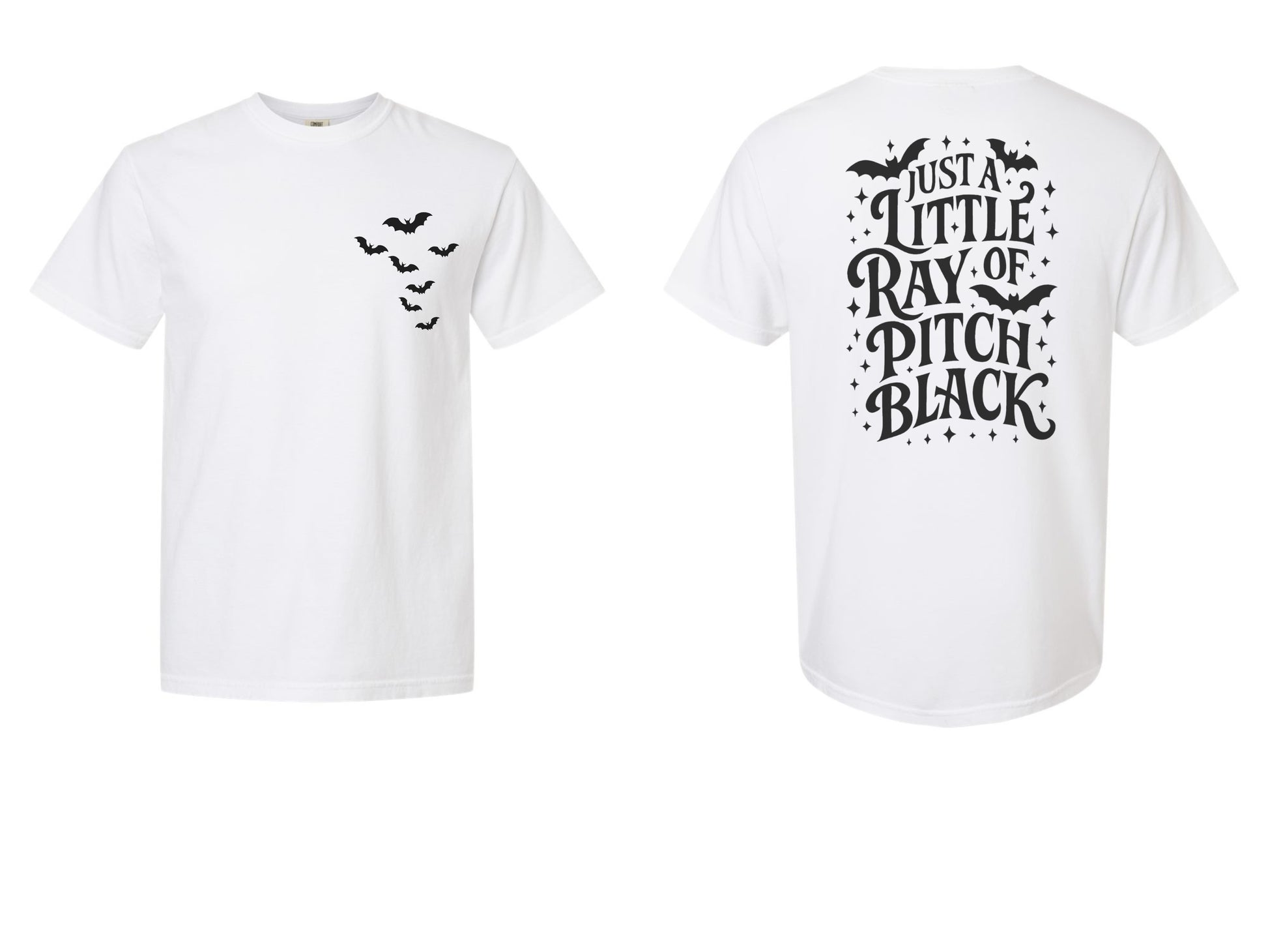The Vibe: A spooky-chic aesthetic featuring a delicate trail of bats on the front and a bold, star-dusted typographic statement on the back.